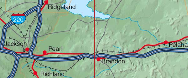 ![]() Detail View of the Cartographic style relief rendering when placed under the Vector EPS map. Any of the 5 relief styles may be used as alternative background textures to customize this map. Contrast of the relief map layer may be dimmed by adjusting the opacity - for Mississippi is set to 60%. Select the Relief & EPS Map Package of Mississippi option to download this style map collection. |