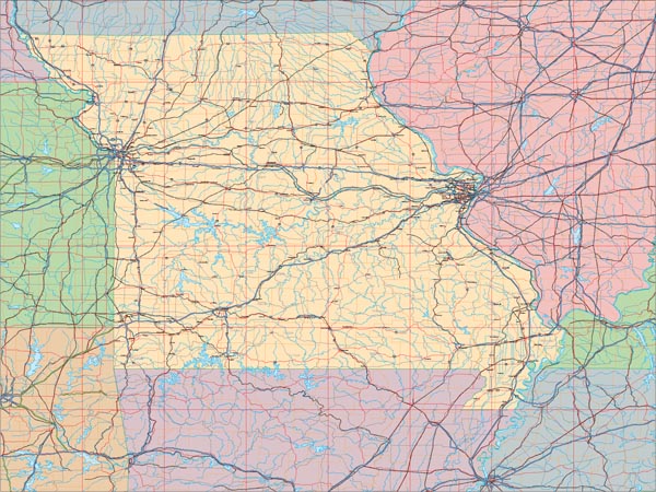 ![]() Detail view of EPS Vector Map of Missouri - the land fill color is switched on. The EPS Vector map for Missouri has 29 or more layers which may be individually modified or removed. Select the Vector only EPS map of Missouri option to download this style map. |