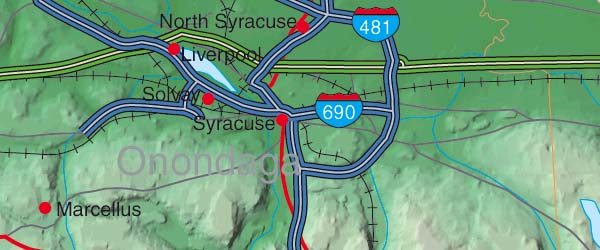 ![]() Detail View of the Cartographic style relief rendering when placed under the Vector EPS map. Any of the 5 relief styles may be used as alternative background textures to customize this map. Contrast of the relief map layer may be dimmed by adjusting the opacity - for New York is set to 80%. Select the Relief & EPS Map Package of New York option to download this style map collection. |